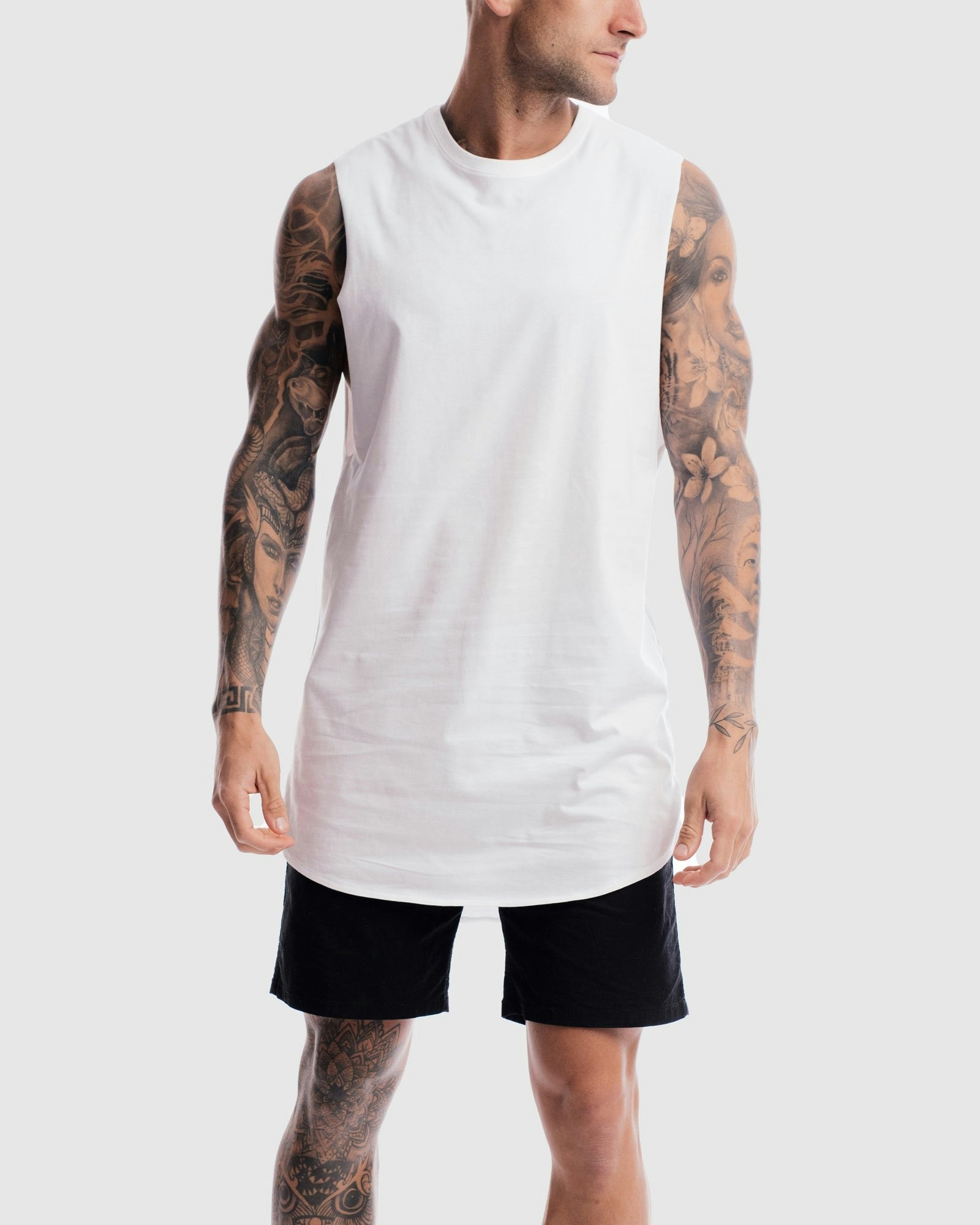Our model is wearing a size medium tank. He is 6 ft (182cm) tall with a 37inch (94cm) chest and a 30inch (78cm) waist.
