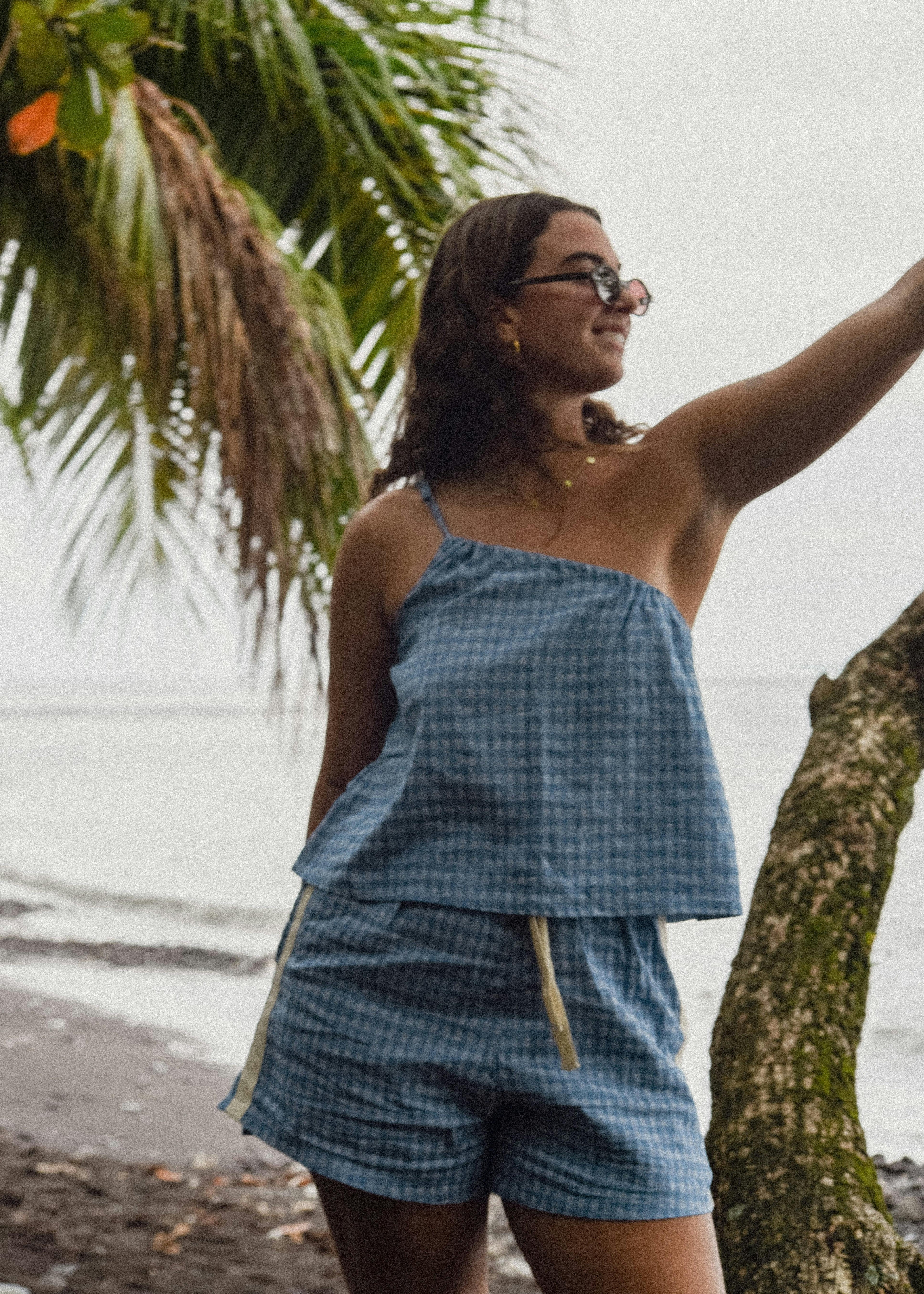 Our signature shorts reimagined in a breezy gingham weave. Featuring canvas side stripes, contrast drawstring, handy pockets, and a flattering side split, these shorts bring together comfort and a feminine touch — just right for post-swim strolls or seaside sprints.