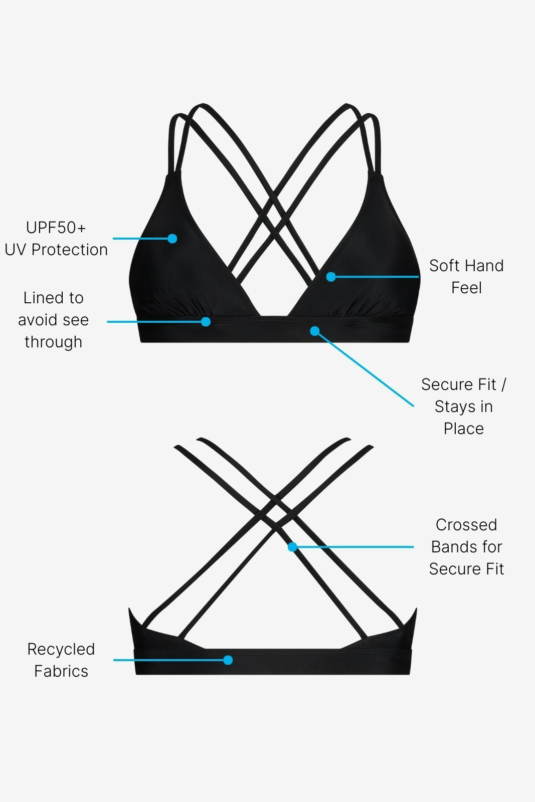 This black bikini top is designed for active days. With crossed back bands, it provides extra security and support during any water activities. Say goodbye to worrying about wardrobe malfunctions and hello to confident, carefree water fun.