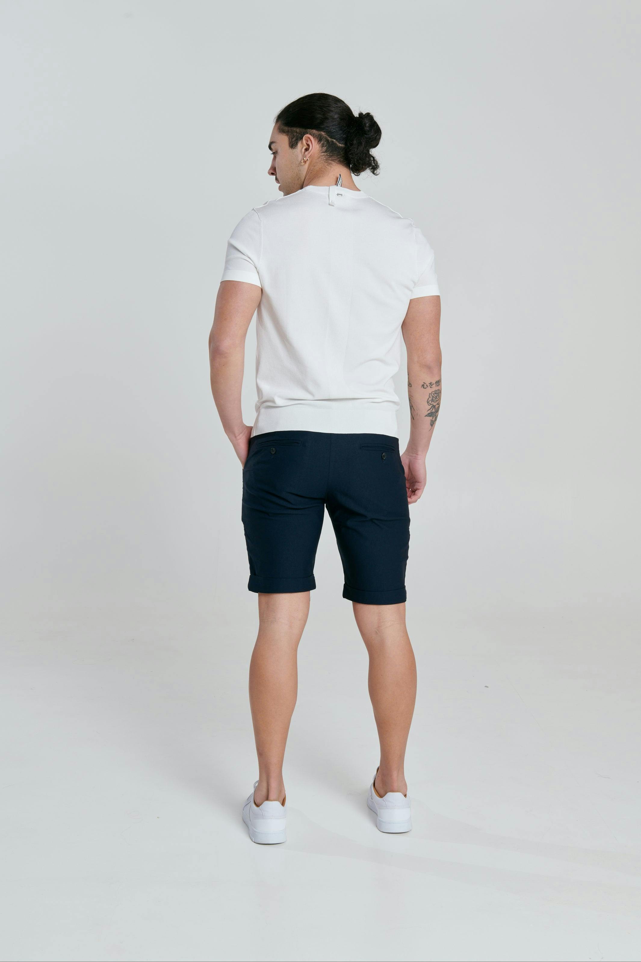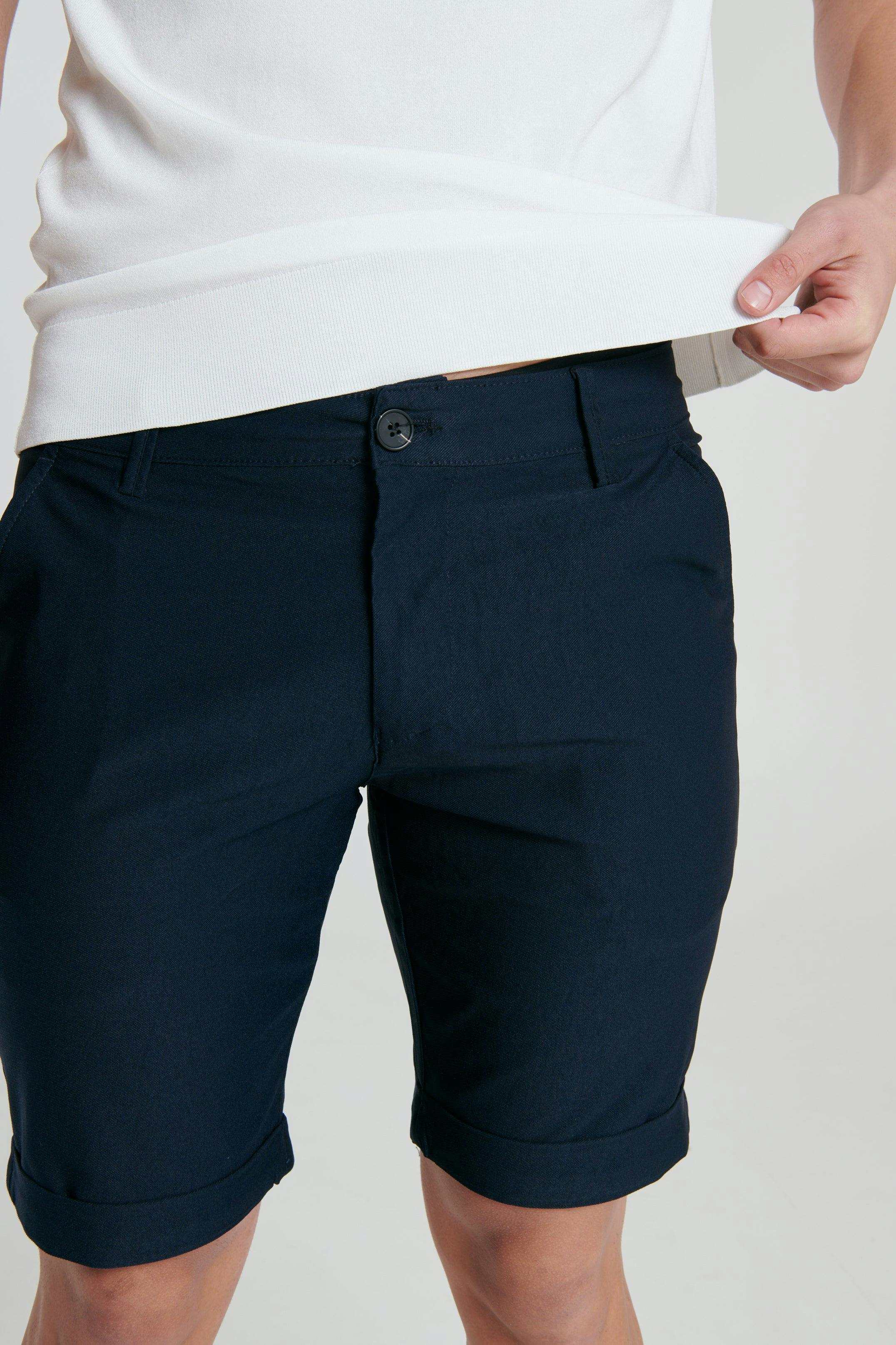 The Birmingham Navy Pant Short delivers a clean, tailored look with everyday comfort. Designed with a modern slim fit, these shorts sit just above the knee and feature a refined rolled hem for a sharp finish. Crafted from a soft, breathable stretch fabric, they move with you while keeping their structure all day.
