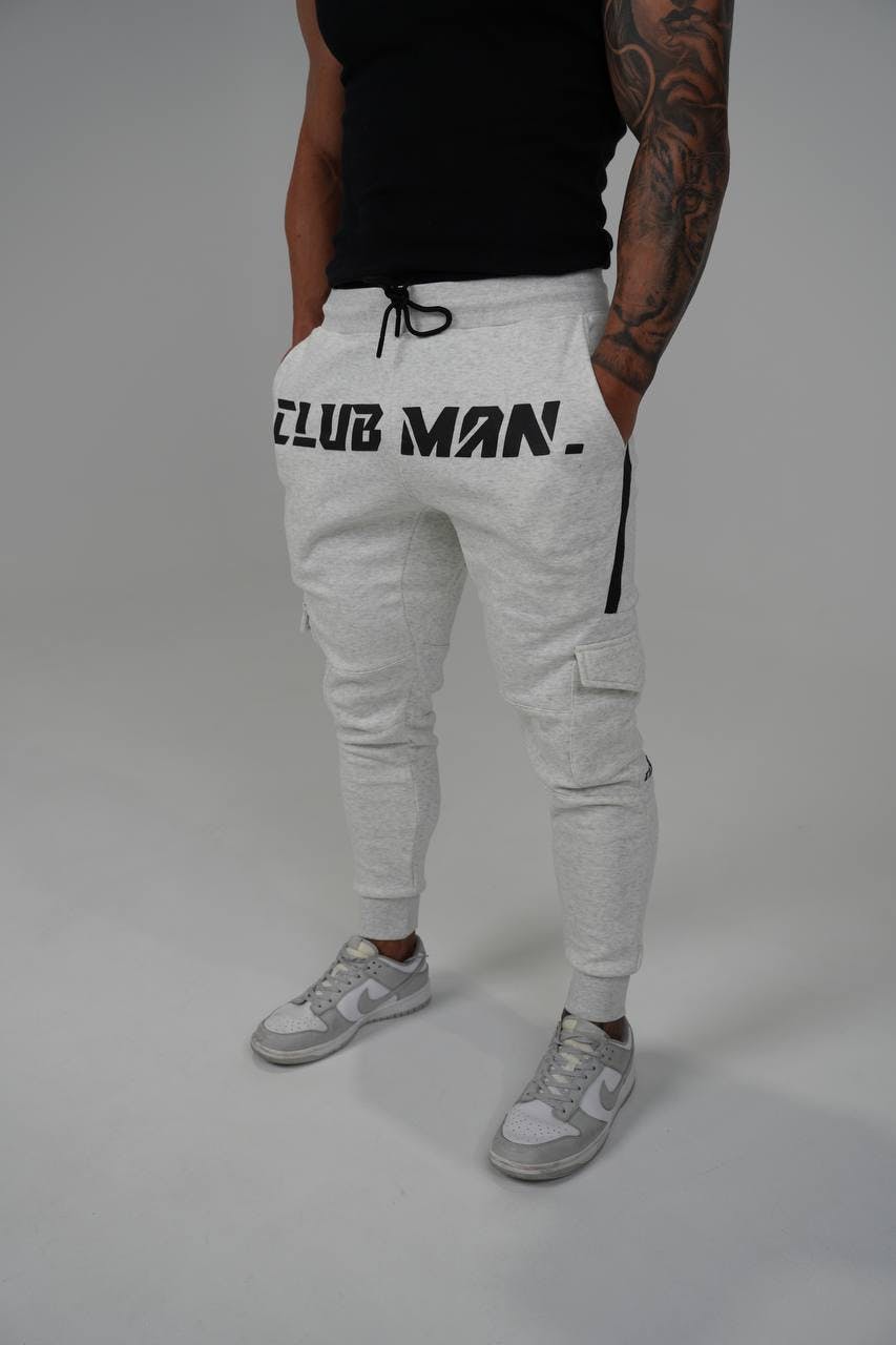 Introducing the Clubman 'Urban Explorer' Cargo Trackies in light grey with black logos. These trackies are crafted from high-quality fleece for ultimate comfort and warmth, while the functional cargo pockets add a utilitarian edge. Designed with a modern, tapered fit, they offer both style and practicality, perfect for on-the-go days or casual lounging. The standout puffy logo elevates the look, making these trackies a must-have for anyone seeking a balance of fashion and function.