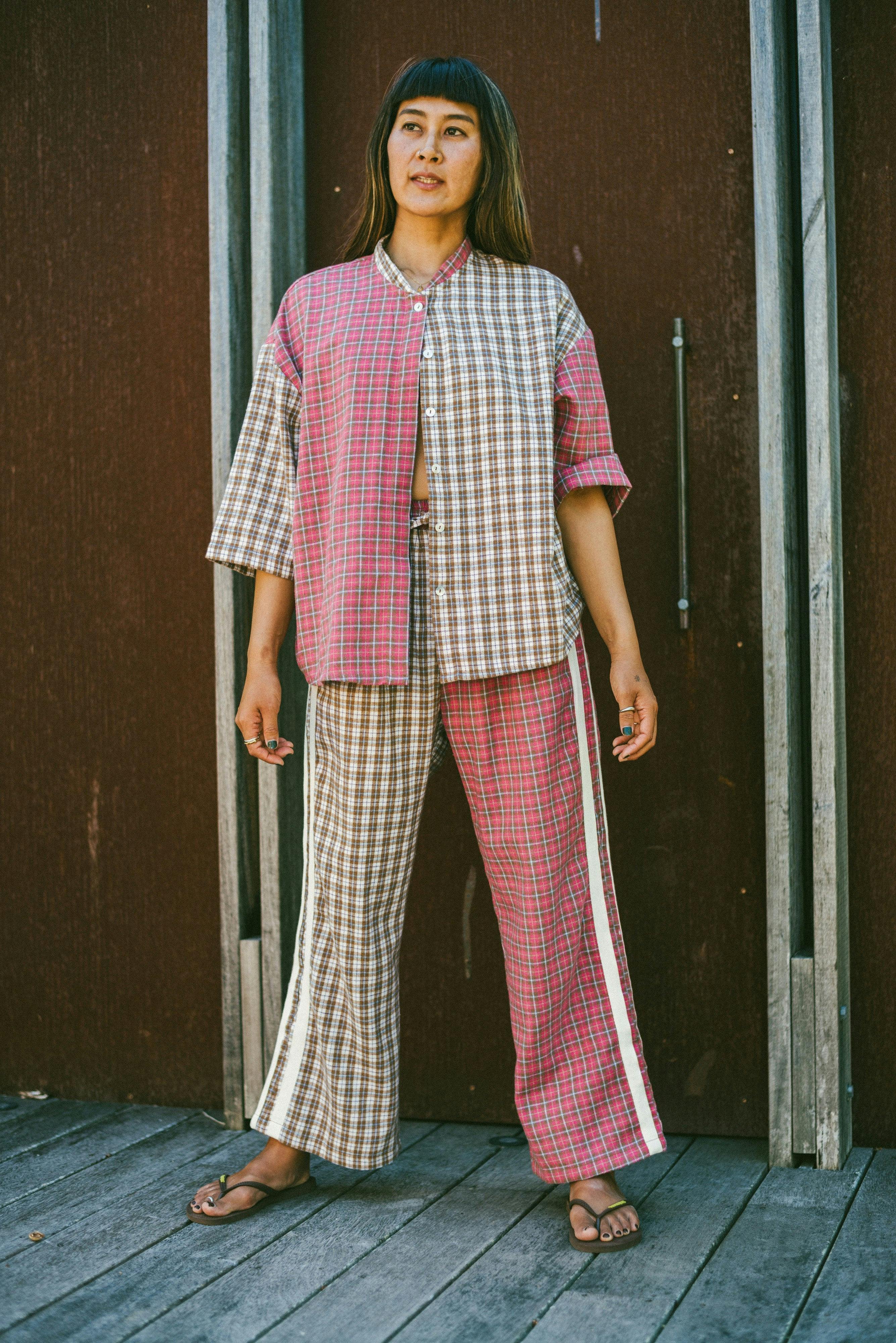 back charm of a classic flanno. A more fitted silhouette through the hips (sans pockets for a smoother shape) flows into a playful kick flare at the