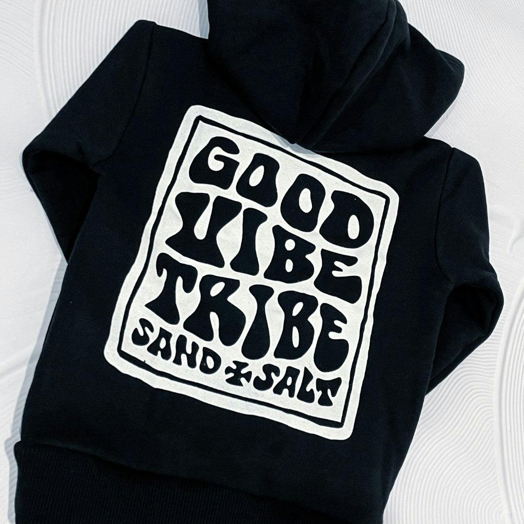 Let your kids join the "Good Vibe Tribe" with our stylish and comfy hoodie from Sand + Salt Kids. Features a bold "Good Vibe Tribe" graphic on the back and a smaller logo on the front, making it a perfect statement piece for your little ones.