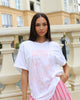 Our model is wearing a size Medium for an oversize fit and normally wears a size small. She is 5 ft 8 inches (174cm) tall with an 81cm bust and a 63cm waist.