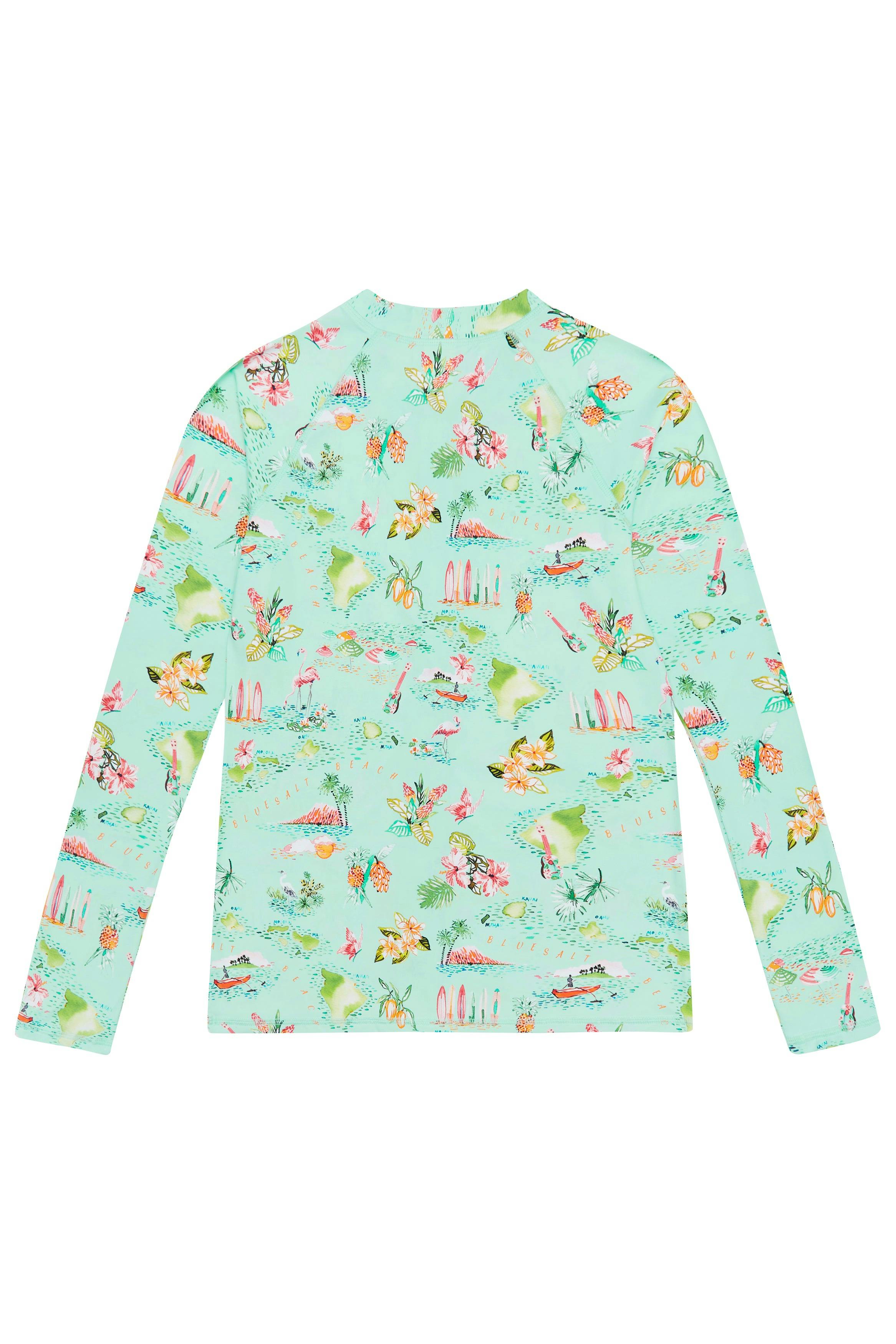Vintage Hawaiian print bikini and rash top with with frill top and pant with good coverage.