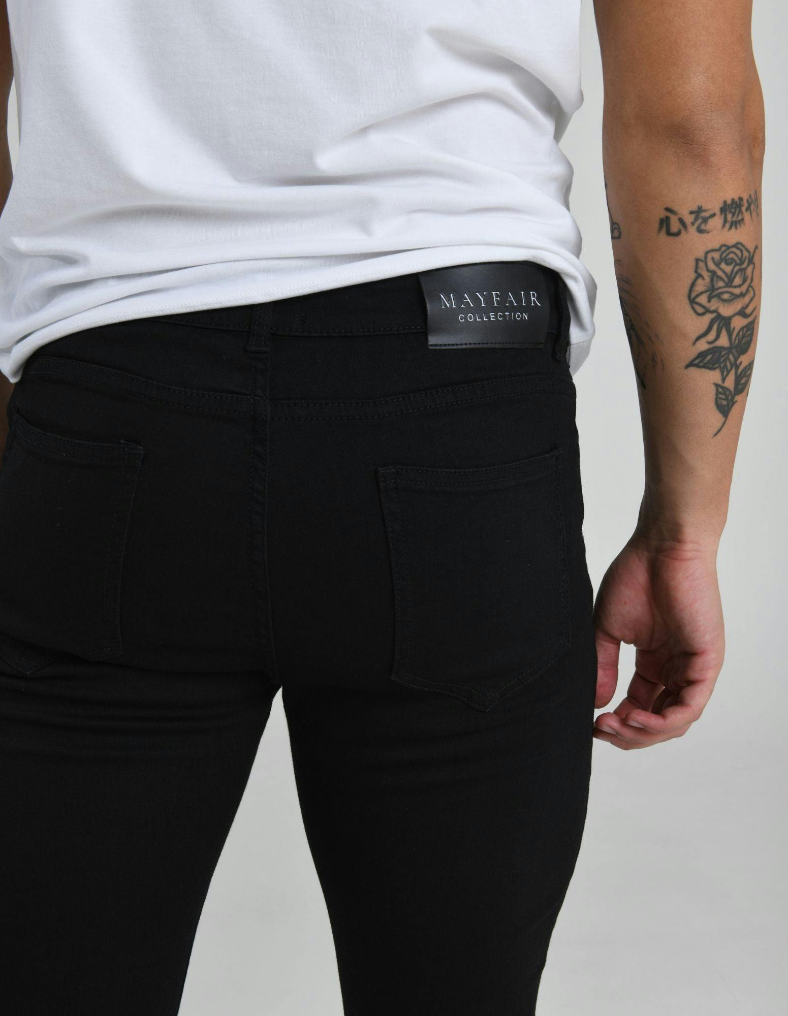 The Kensington Jeans are a deep Charcoal denim, a wardrobe staple to go from day to night and a sleek alternative to the blue denim . The Kensington Jeans stay true to the signature Mayfair fit, high-end fabrics made with a denim cross elastane material.  These jeans can just as easily be worn under a collared shirt fulfilling a semi-formal dress-code as they can be under a crew neck tee with fresh kicks.