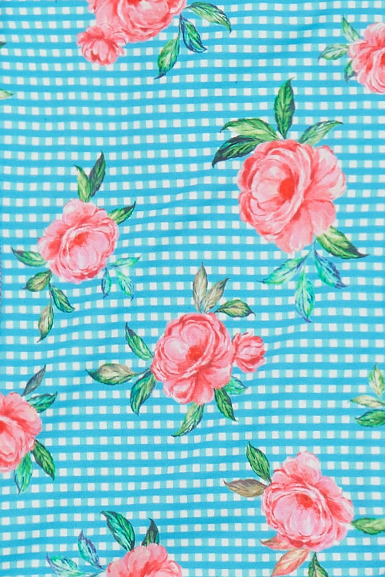 - Turquoise gingham print with pink flowers this suit is made from a superior recycled fabric and which is beautifully soft and light to wear