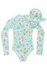 Girls long sleeve swimsuit with matching beach hat will keep your little girl looking very cute this summer and give her excellent sun protection.