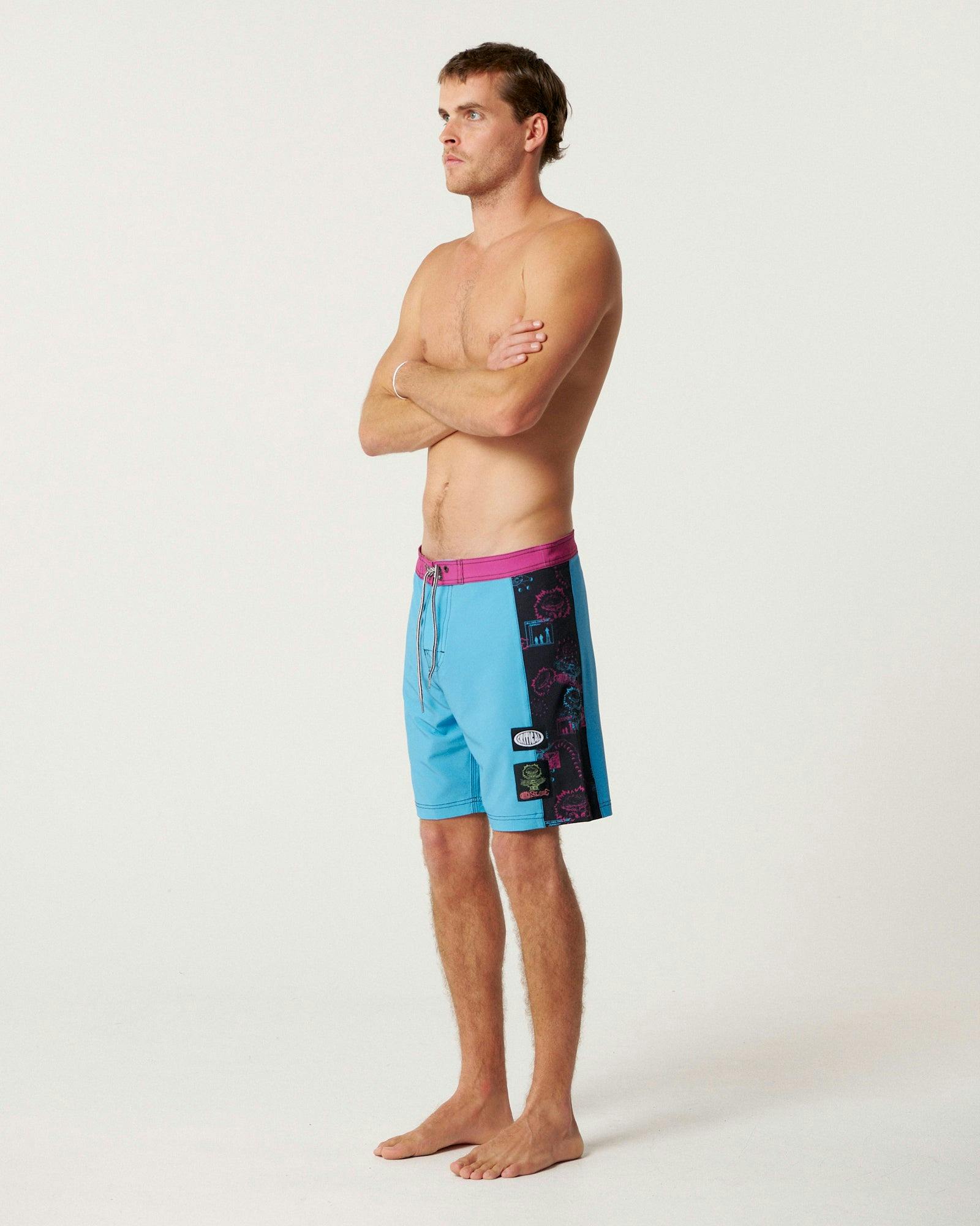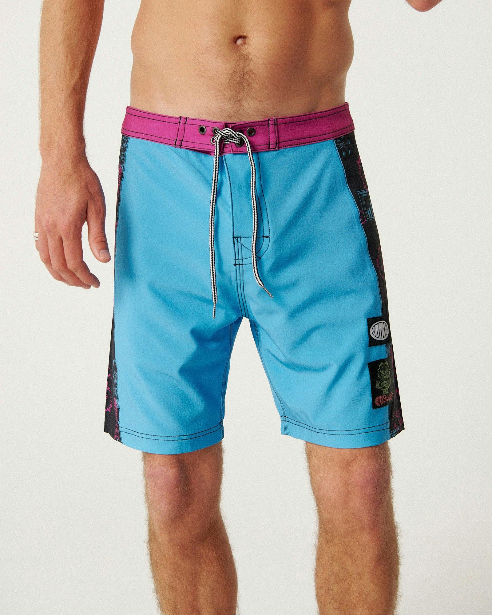 The Madness Boardshort is built from a 4-way stretch poly/spandex blend for comfort and mobility. Running an 18" outseam, it sits right on the knee. Details include contrast side panels, a button-down back pocket, and an extra set of eyelets so you can cinch the waist in an additional inch. Our model is 6'1" and wears a size 32. We recommend taking your regular size. Designed and wear tested in Bondi, Australia.