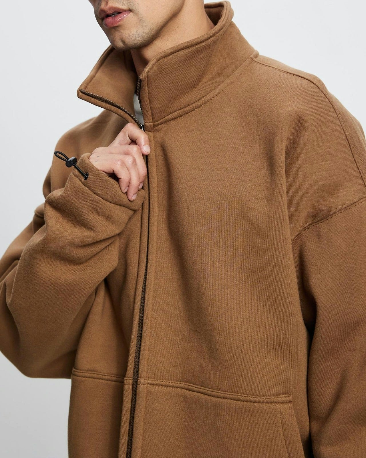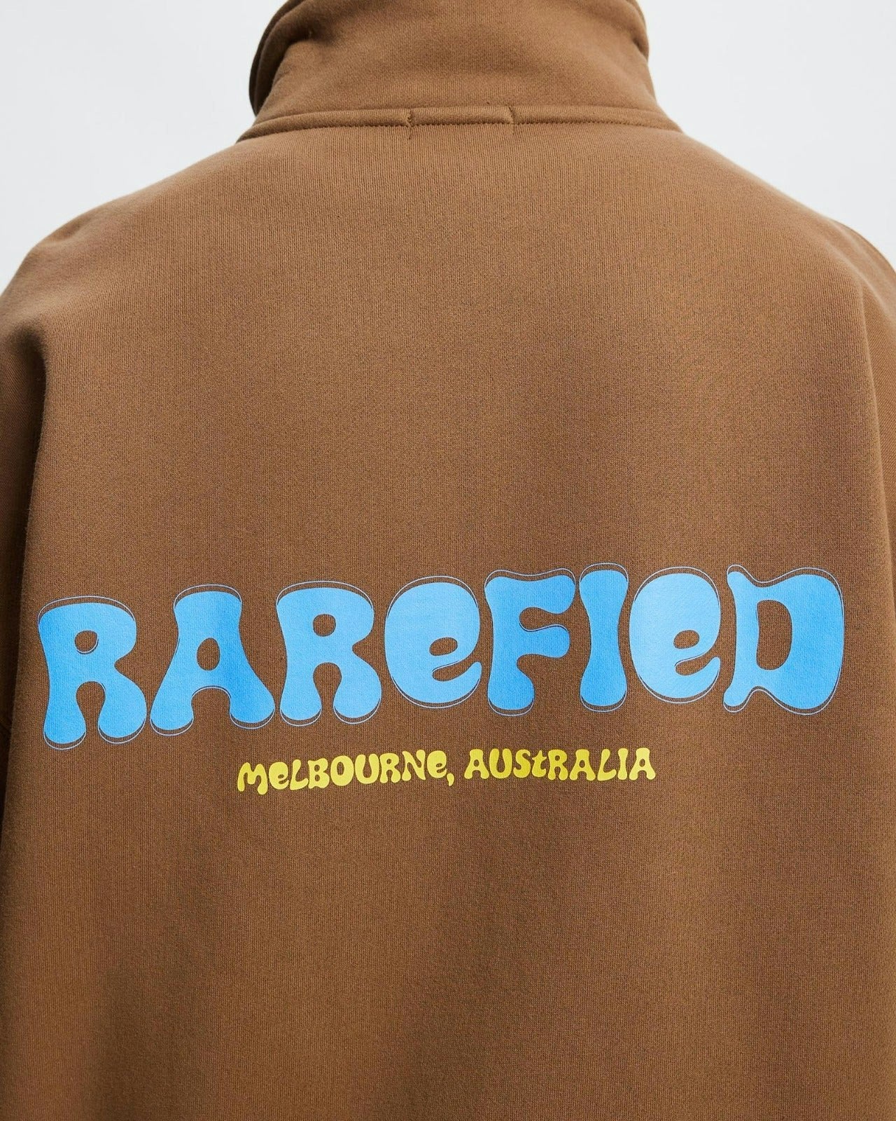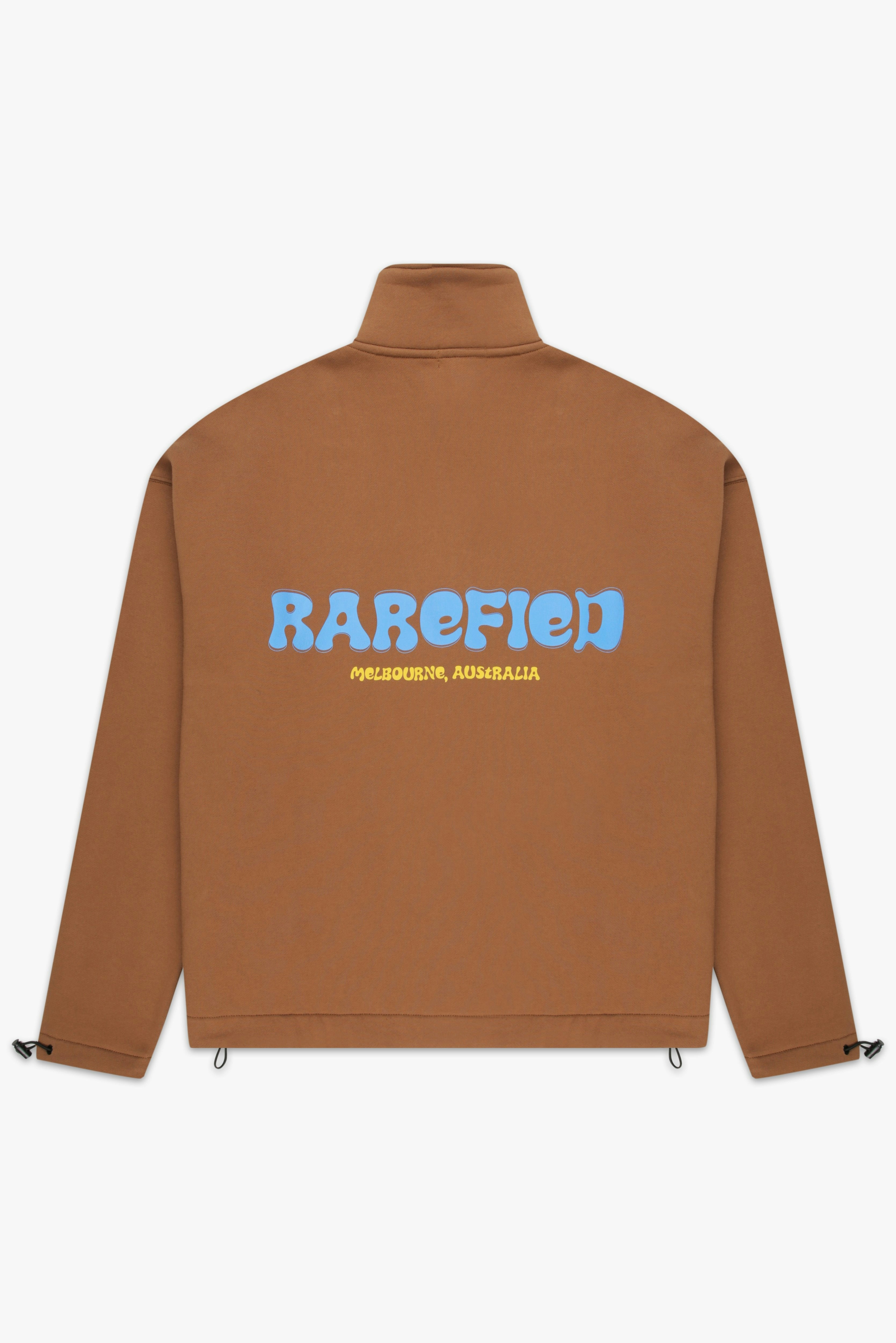A heavyweight cotton zip-up jacket featuring an oversized fit, stand collar, kangaroo pockets, and bold ‘RAREFIED Melbourne’ branding on the back.