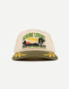 - Deep army green brim with golden embroidered palm leaves for subtle pop