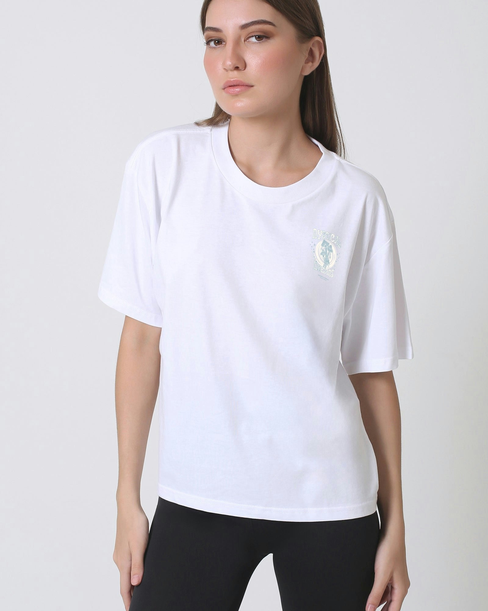 Our model is wearing a size Medium for an oversize fit and normally wears a size small. She is 5 ft 8 inches (174cm) tall with an 81cm bust and a 63cm waist.