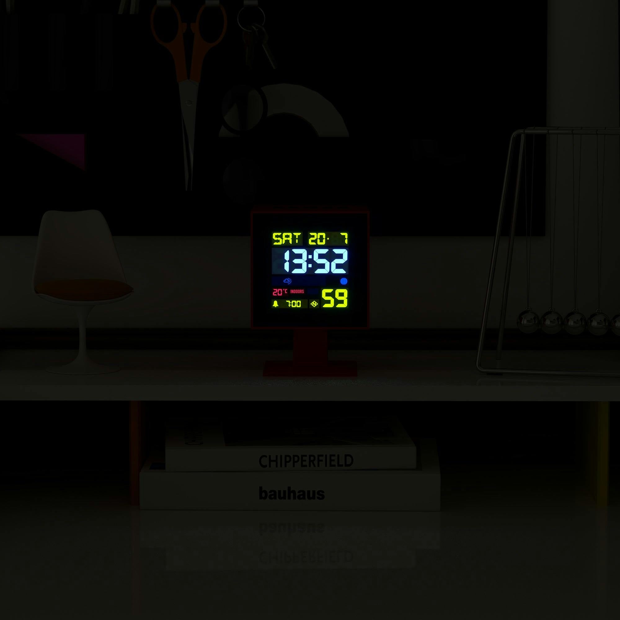 Newgate Monolith Lcd Alarm Clock Fire Engine Red Angular, red LCD alarm clock on a square stand with a black screen and bright, coloured digits. The Monolith offers ground-breaking retro aesthetics and impressive functionality.