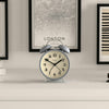 The Theatre Alarm Clock with a Matt 'French' Navy finish, contemporary graphic dial and a moving hammer and twin-bell alarm.
