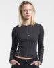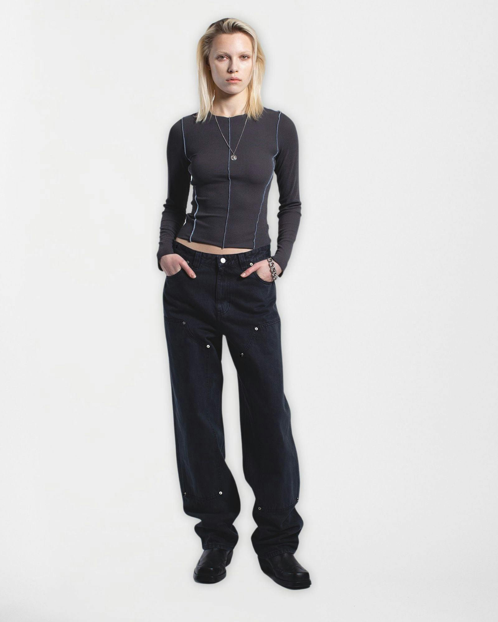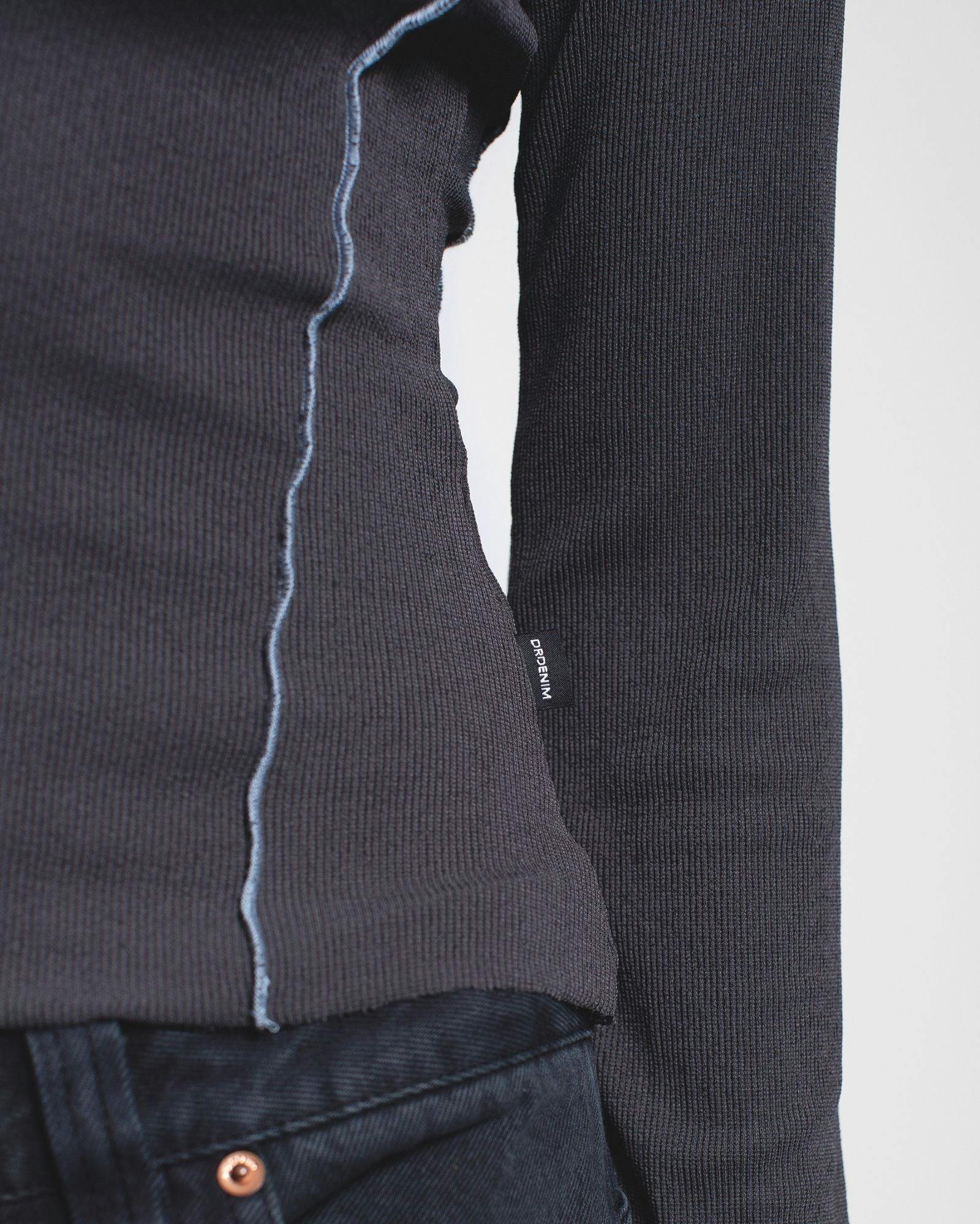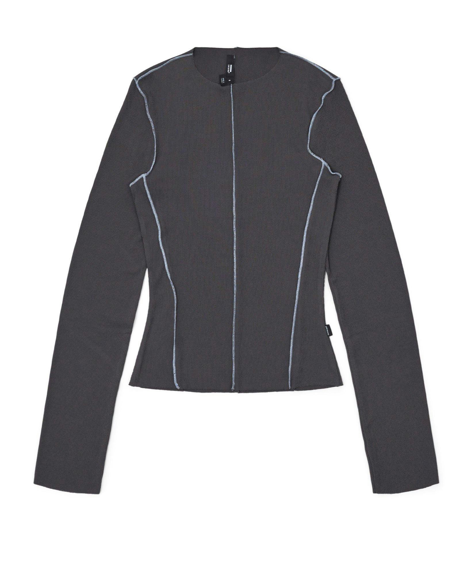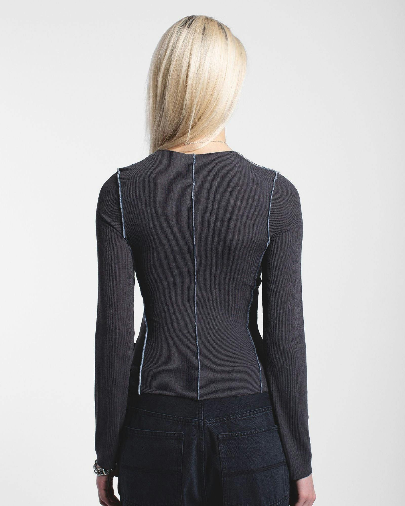 Shop the Nicola Long Sleeve Rib Top in Asphalt Contrast. A sheer rib knit with contrast stitching and a regular fit - perfect for layering or everyday wear.