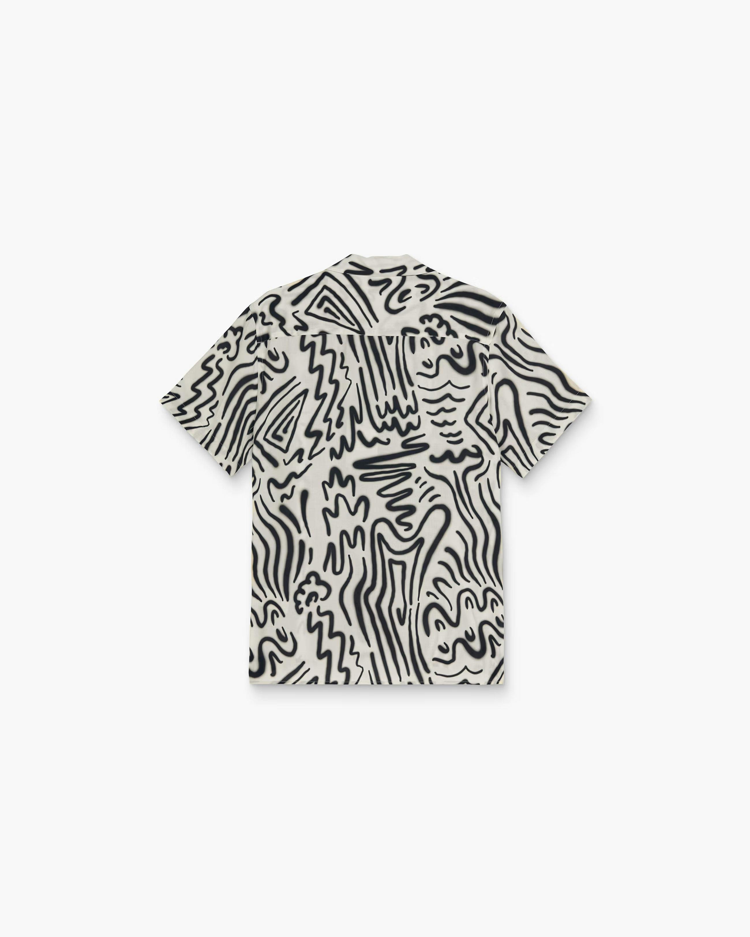 Black and white short-sleeved viscose shirt. Lightweight and breathable with a silky soft feel. Relaxed fit, slightly dropped shoulders.