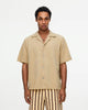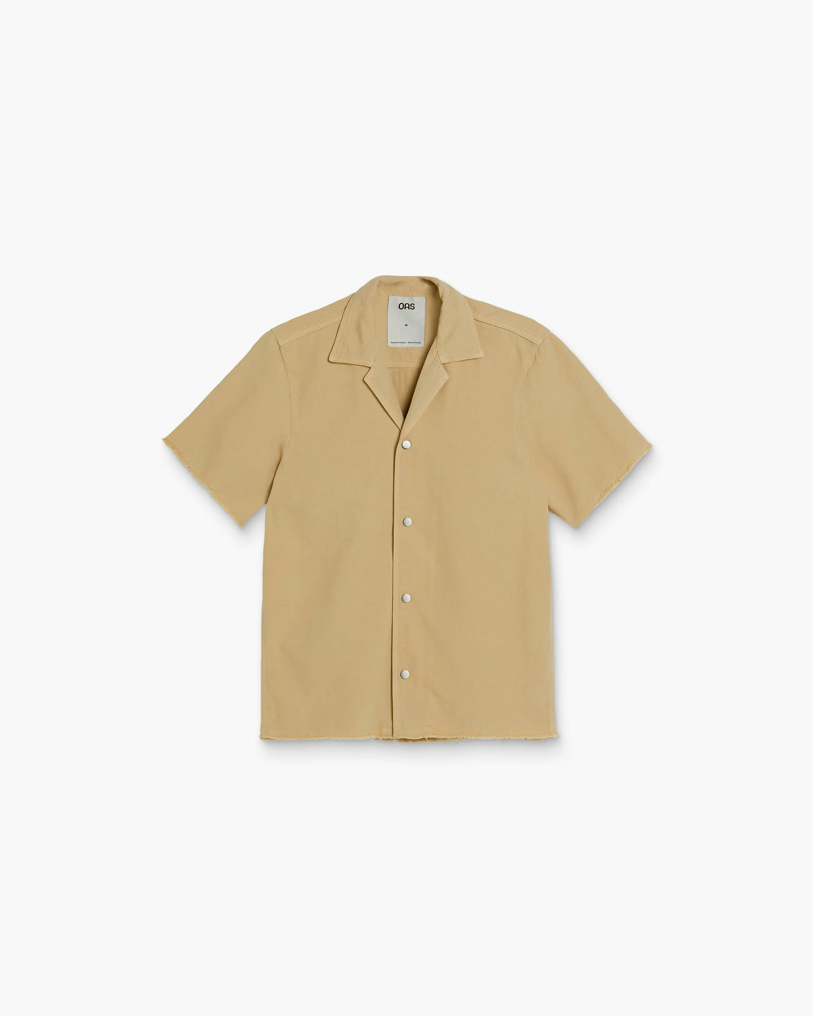 The Latte Bodega canvas shirt is tailored in a relaxed shape with a resort collar and metal snap buttons throughout the front. Crafted from cotton canvas and linen in a sandy hue, finished with frayed edges.