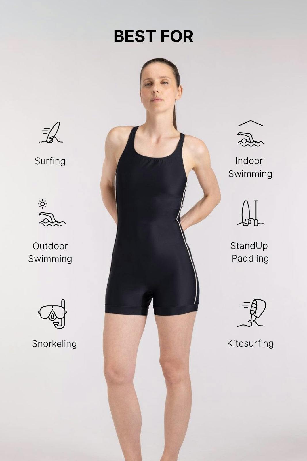 Take on the water in style and comfort with our One Piece Swimsuit! Designed with an ultra-slim racerback and boyleg cut, this high-performance suit offers maximum shoulder mobility and extra coverage. Made from eco-friendly technical fabric, it's resistant to chlorine and provides sun protection. Dive in and enjoy!