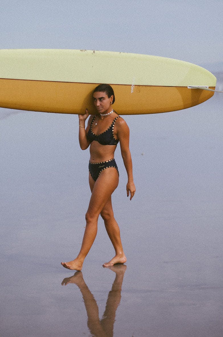 This piece has been discounted due to a manufacturing flaw in the gold print. While the swim fabric, construction, and fit are all up to our usual standards, the gold detailing may fade or wear away faster than intended with regular use.