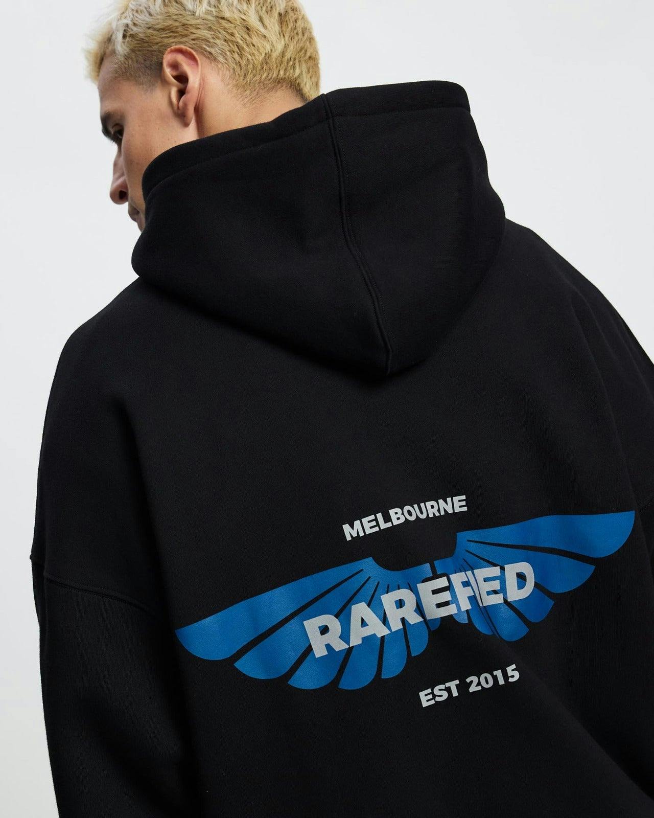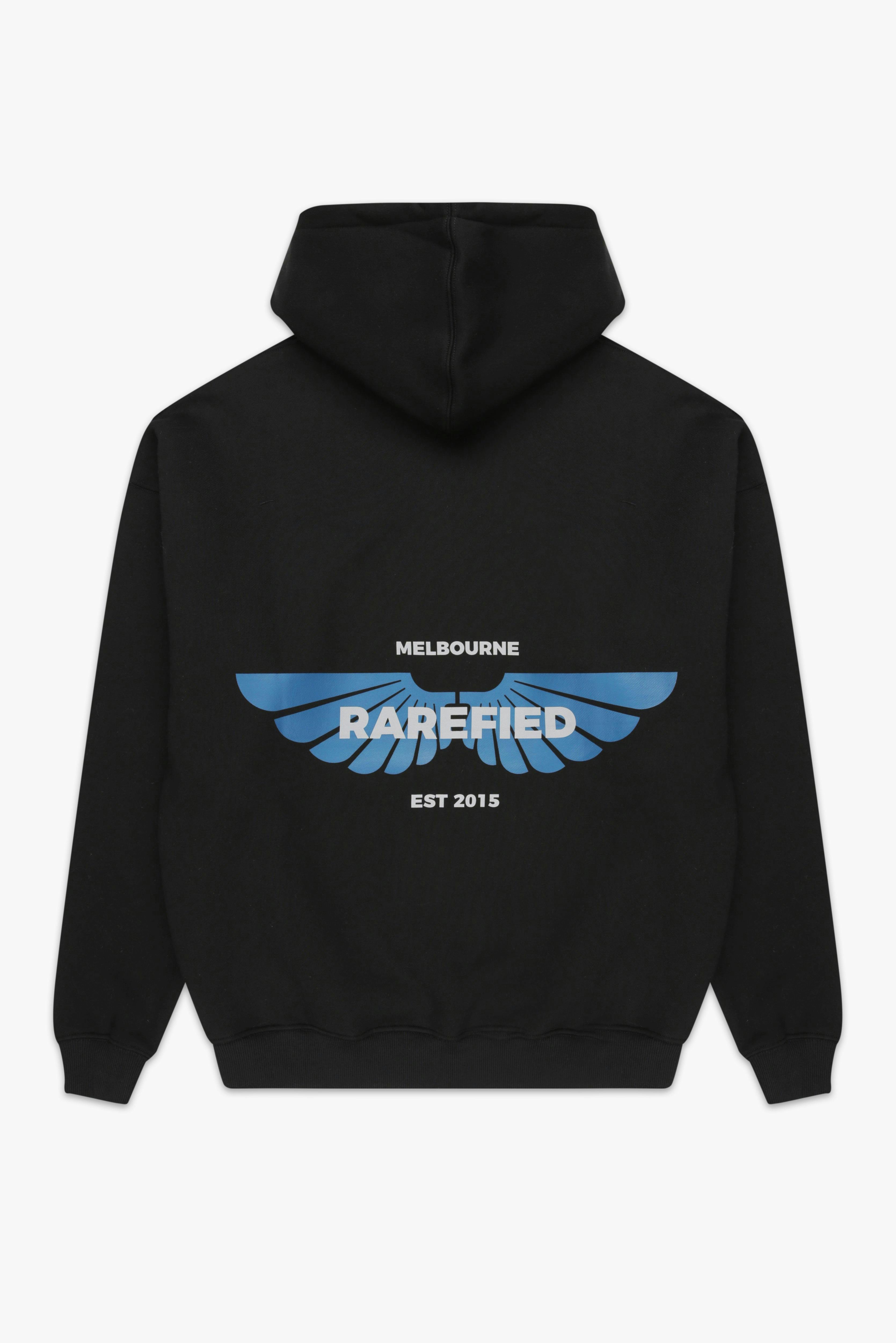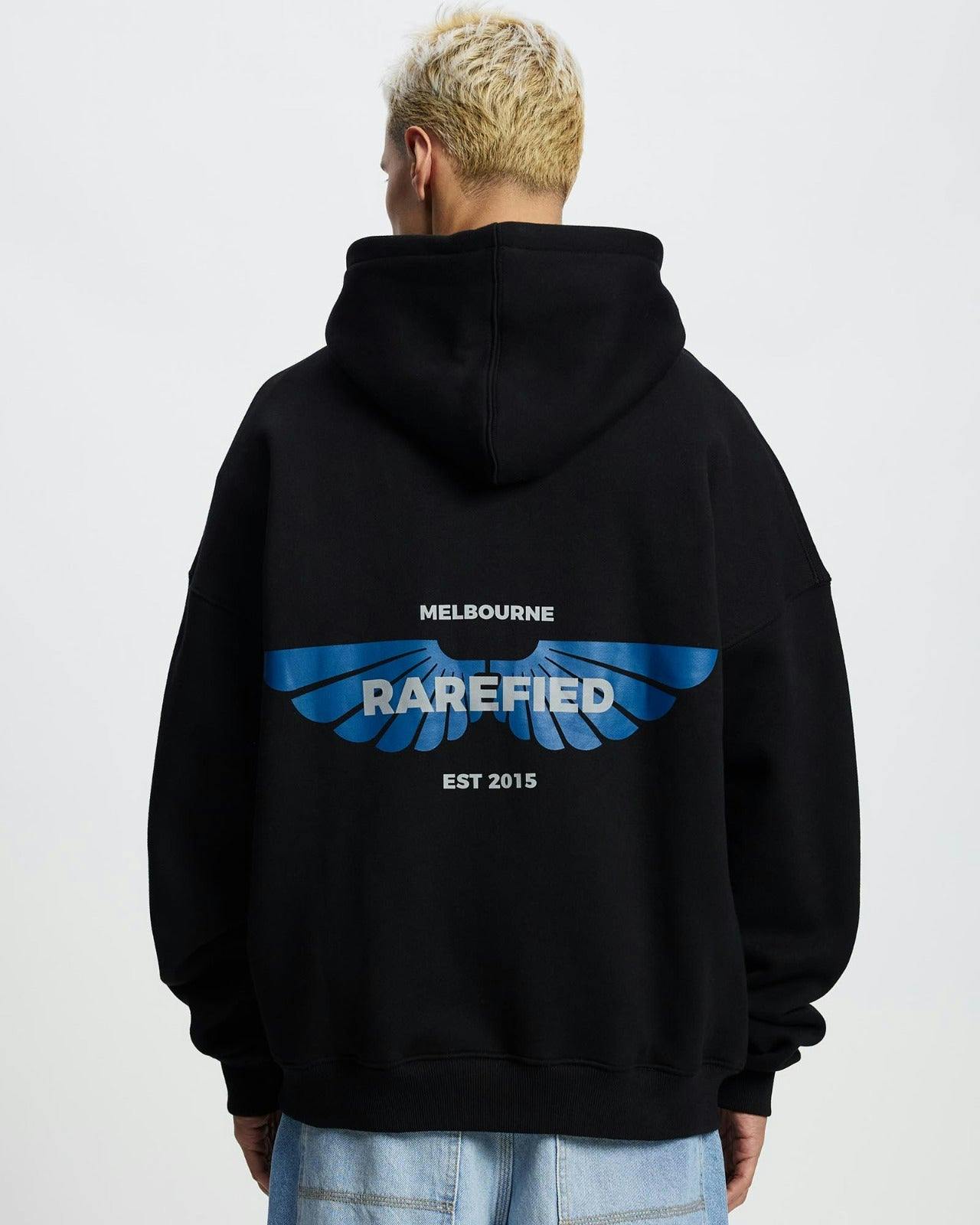 A heavyweight cotton pullover hoodie with bold winged RAREFIED graphics on the front and back, finished with an oversized fit and kangaroo pocket.