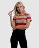 The Burnt Caramel Crop Tee is an essential to add to the wardrobe. Featuring large warm-toned stripes, this yarn dyed premium 100% cotton crop will keep you looking fresh all year long. Pair with distressed denim and vans to keep the look casual.