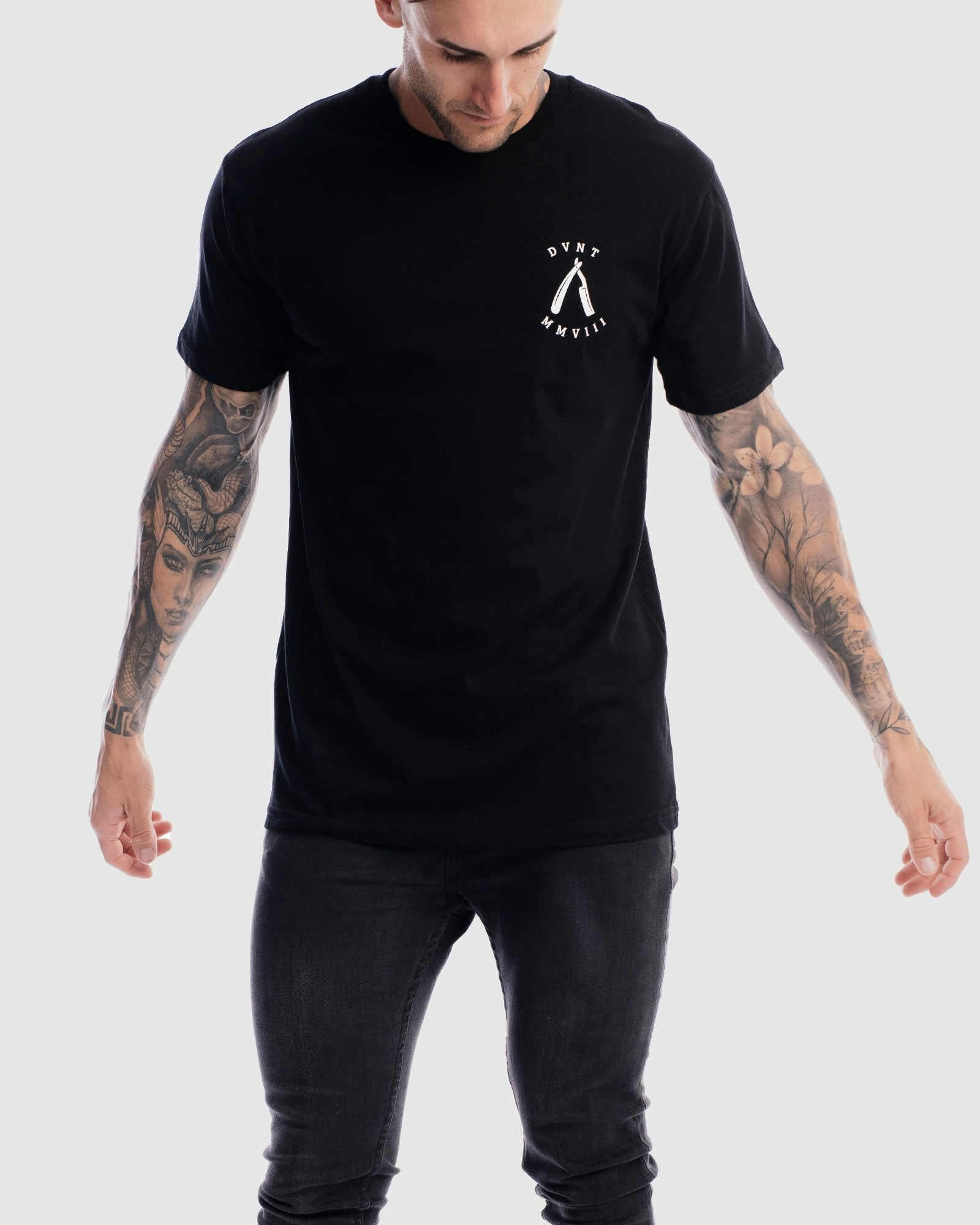 Inspired by the classic style of the 1950"s barber shop. The "DVNT Rough Cuts Tee" pays homage to the slick haiRed greasers of the day. The original rebels without a cause. This tee is a wardrobe staple that will never go out of style due to its clean yet eye-catching graphic.