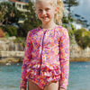 The Harper Rashie combines playful design with practical protection. Crafted from UPF 50+ and chlorine-resistant fabric, it keeps delicate skin safe while colours stay bright all season. A full-length front zip with a comfort zipper guard makes changes quick and comfortable, while the sweet double-ruffle hem adds a touch of fun. Designed for versatility, it can be worn on its own, paired with bikini bottoms, or layered over a one piece — giving endless sun-smart outfit combinations.