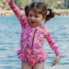 The Izzy Surfsuit is all about playful details and practical protection. Crafted from UPF 50+ and chlorine-resistant fabric, it keeps delicate skin safe and colours bright all season long. The long sleeves and a high neckline mean less sunscreen battles for Mum & Dad. While the gorgeous ruffle leg detailing around the leg means this cossie is made for splashing, playing, and memory-making all day long.