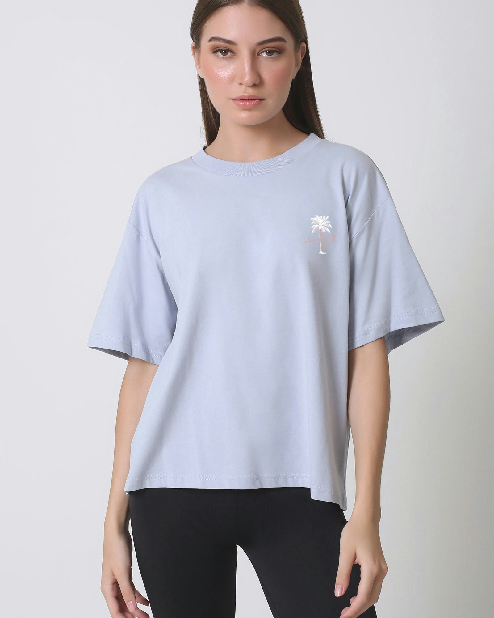 Our model is wearing a size Medium for an oversize fit and normally wears a size small. She is 5 ft 8 inches (174cm) tall with an 81cm bust and a 63cm waist.