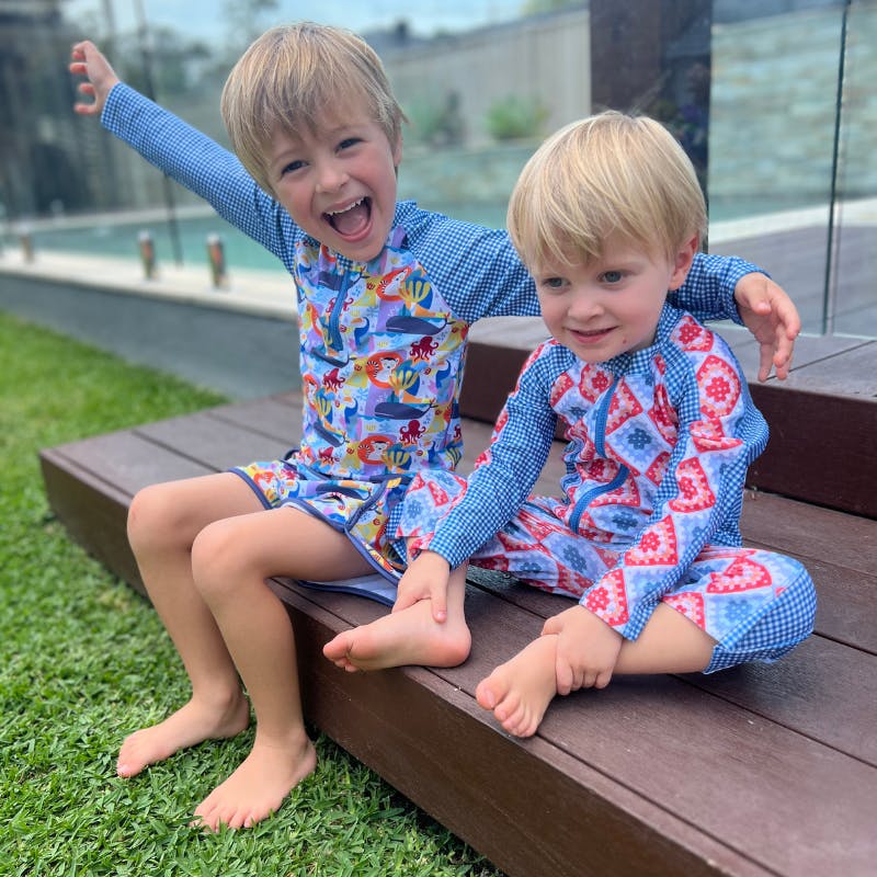 Long sleeve and long legs make this the full cover sun protection that you have been looking for. It has a full length open-ended zipper so the suit is easy to put on and take off. The zipper has a facing that protects against nipping soft skin. The chin guard shields the neck from the zip hardware and likewise the fold-over closure at the zip end on the ankle. A raglan sleeve is designed with a 2-piece sleeve using flat-lock seams to eliminate ridges. The bold red-and-blue granny-square diamond print with a contrast blue zip adds a cheerful vintage twist that parents will prize and children will cherish.
