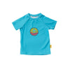 Classic cut short sleeve rash vest. Seafaring aqua and ocean preservation paired together in a solid colour with a soft edge of green and environmental message placement print.