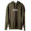 Stylised logo design hand screen printed in a classic cream colour which contrasts perfectly off the dark army fleece.